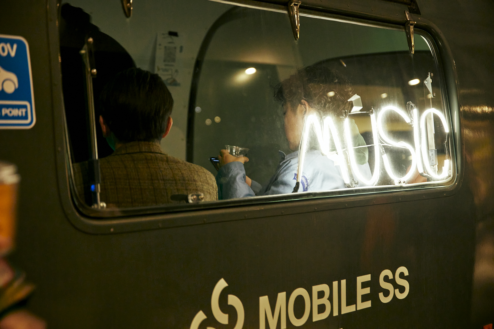 牽引車となるクラシック・ミニでドリンクをオーダーし、小松音響研究所によるサウンドエンジニアリングを備えた車内スペースにて、真空管アンプが放つ上質な音を楽しむことができます。
